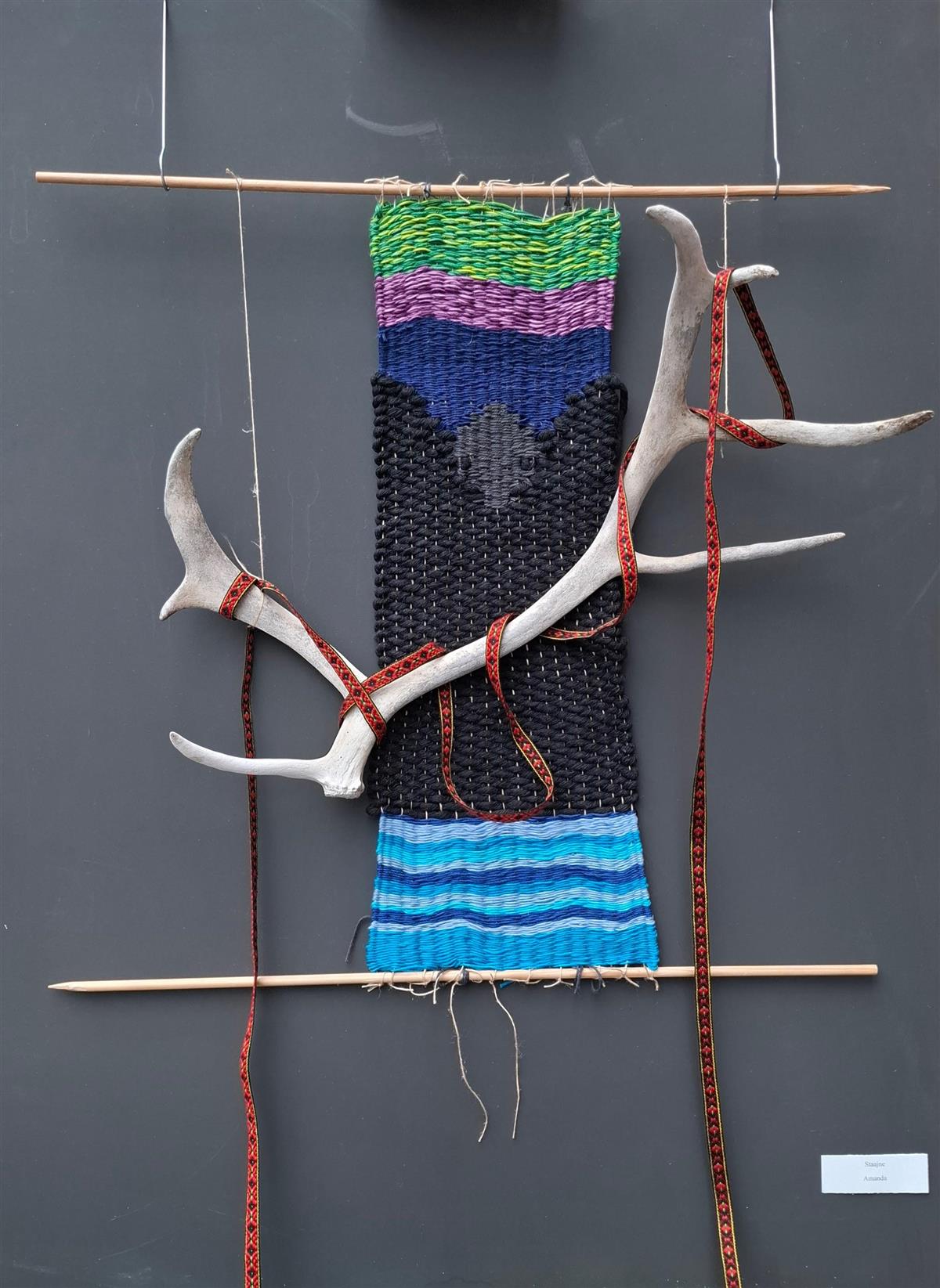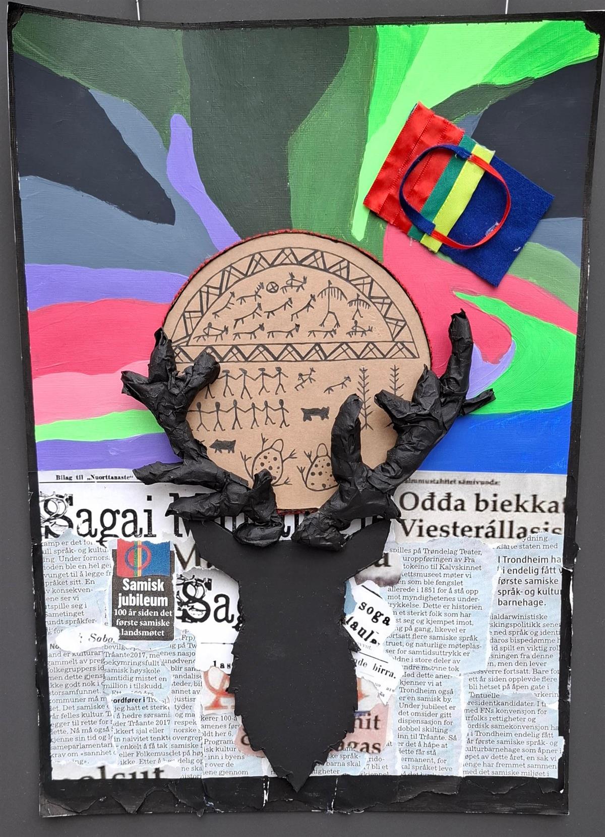 Kunstverk med silhuett av reinsdyrhode med svarte gevir, et sirkelformet motiv med symboler bak, fargerike bakgrunnsstriper og avistrykk nederst. - Klikk for stort bildeFra oppgaven uttrykk av inntrykk Anna Kochen