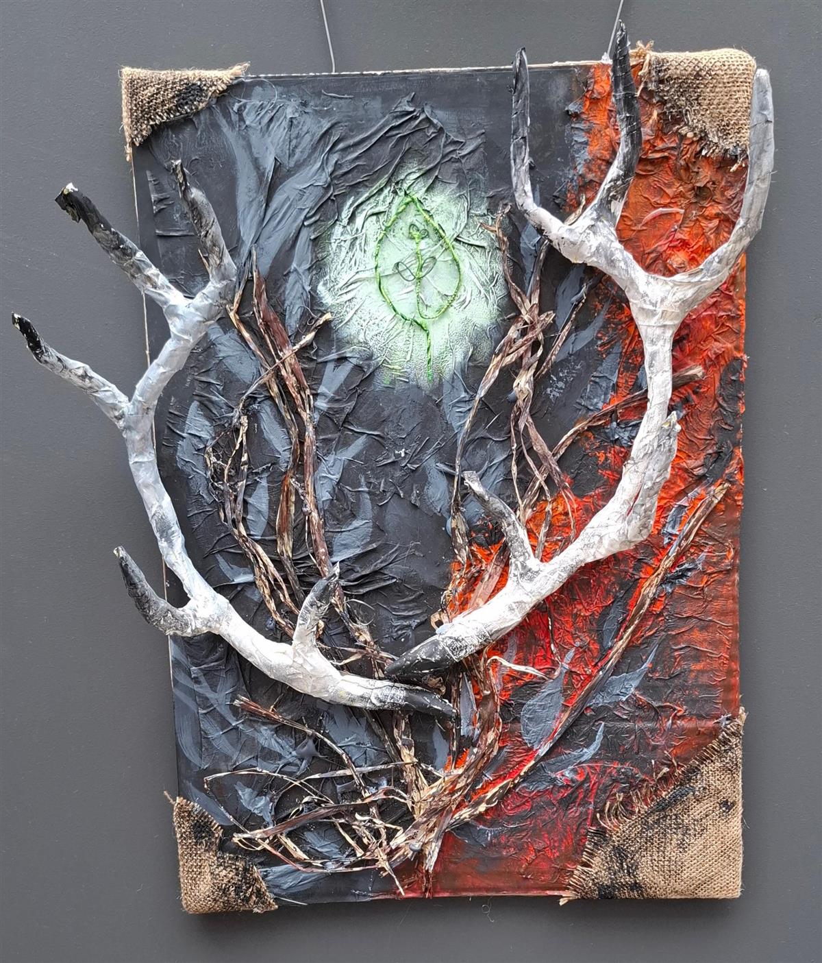 Kunstverk med hvite gevirgrener over en mørk bakgrunn med grønt lysfelt og rød tekstur, omgitt av naturmaterialer. - Klikk for stort bildeFra oppgaven Uttrykk av Inntrykk 2KDA Yuliia Styranka